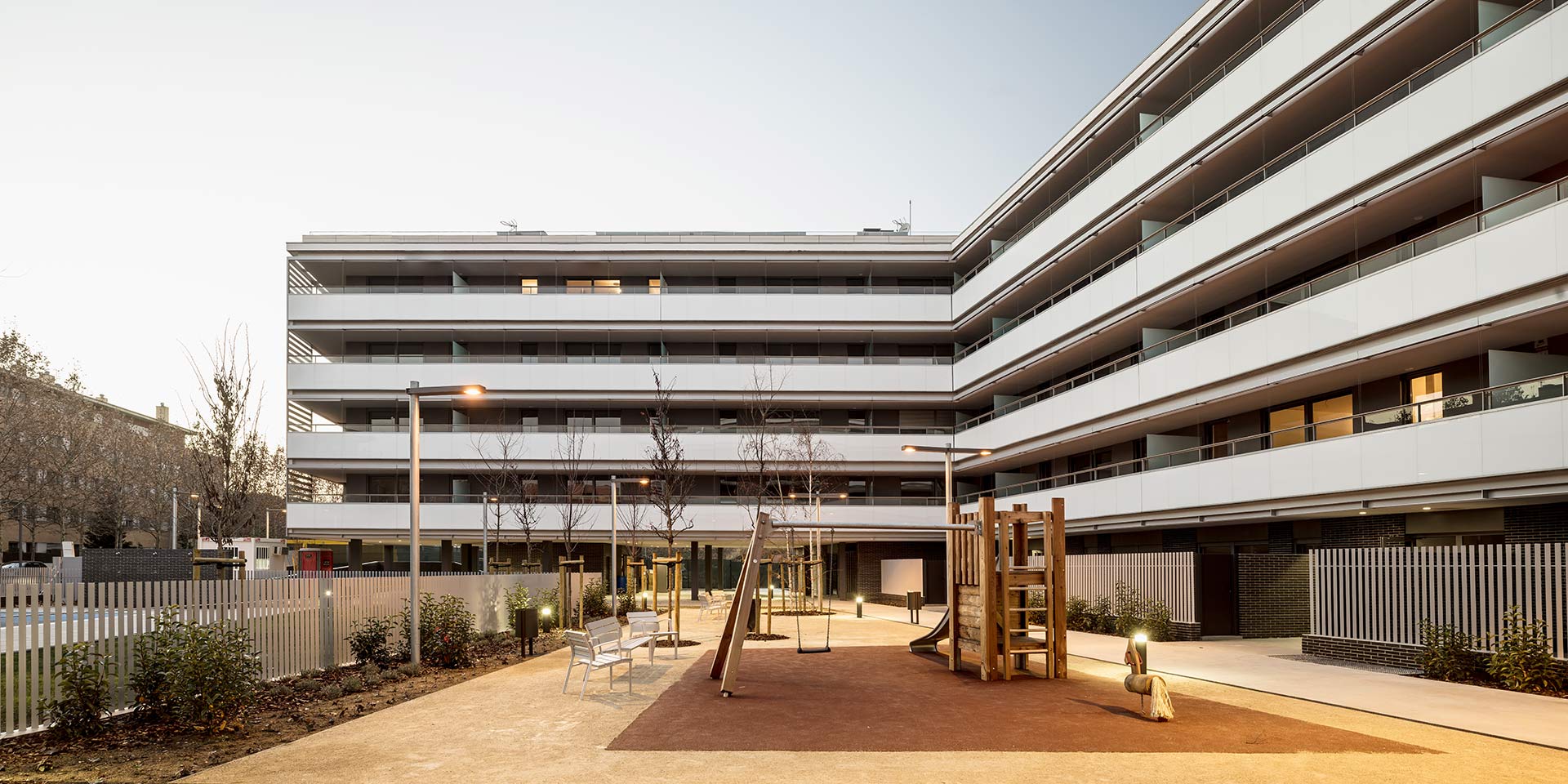 In a very consolidated sector, the plot opens itself in each of its fronts to the different urban situations: the alignment of three linear blocks in the South side – with its corresponding projected shadow -, the isolated volume of the primary healthcare facility in the East side, the preexisting single-family buildings from the “Oller” community in the North side and the vegetal slopes in the West side.